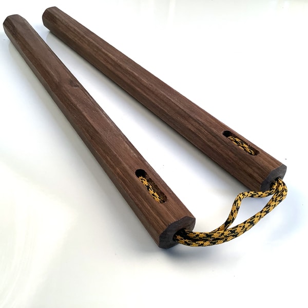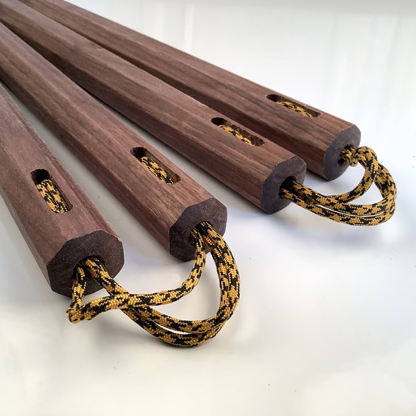 Unlike mass produced martial arts weapons made overseas, we designed our nunchaku to be easy to hold, not get sticky and give you confidence as you practice your forms. Originally the nunchaku was designed from farming tools in China. Occupied Chinese were not allowed to have weapons and a whole range of new weapons sprung from the tools at hand. Our nunchaku are not mass produced, each one is made one at a time. We use exotic hardwoods and try to get every inch of wood used in our product. Some of these woods are hard to find in usable sizes so we take great care to get the most out of each piece. The design is to last and be durable. We take out the least amounts of wood to keep them strong and use rope that will only fill the voids to make them easy to repair. This model uses a 550 para cord tie with three ropes in between the nunchaku. We have re string kits available as well as instruction as to how to re string our nunchaku when it becomes necessary.