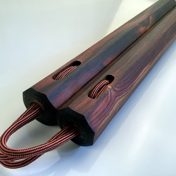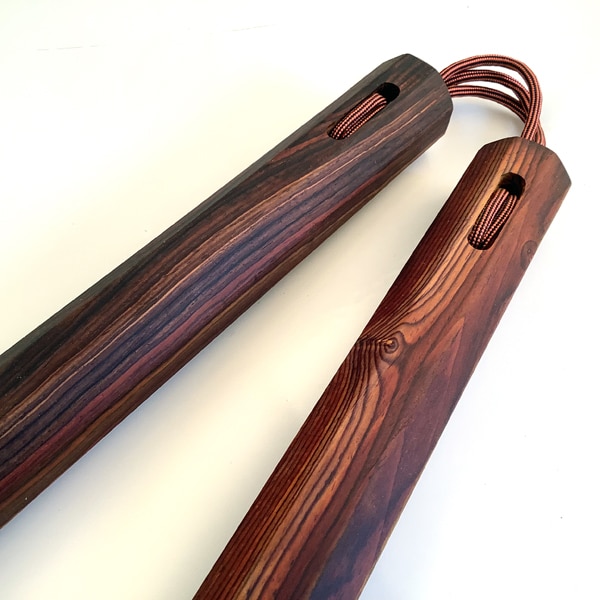 Unlike mass produced martial arts weapons made overseas, we designed our Cocobolo Nunchaku to be easy to hold, not get sticky and give you confidence as you practice your forms. Originally the nunchaku was designed from farming tools in China. Occupied Chinese were not allowed to have weapons and a whole range of new weapons sprung from the tools at hand. Our nunchaku are not mass produced, each one is made one at a time. We use exotic hardwoods and try to get every inch of wood used in our product. Some of these woods are hard to find in usable sizes so we take great care to get the most out of each piece. The design is to last and be durable.