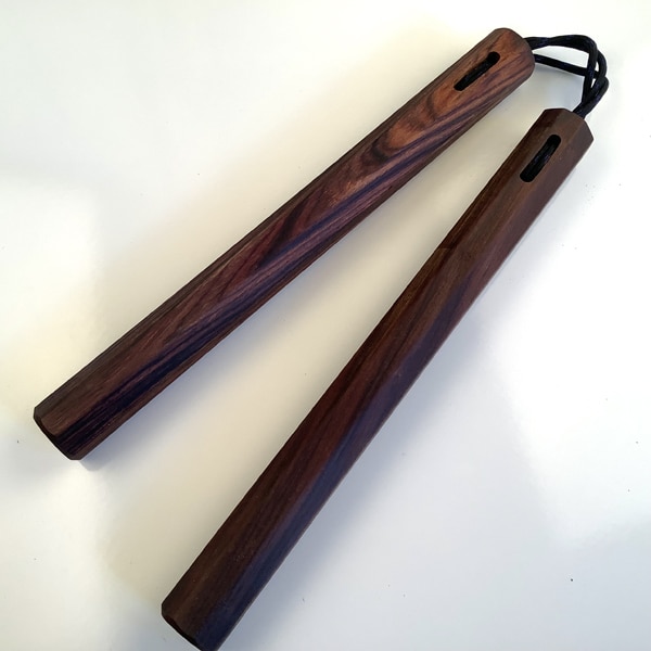 Unlike mass produced martial arts weapons made overseas, we designed our Cocobolo Nunchaku to be easy to hold, not get sticky and give you confidence as you practice your forms. Originally the nunchaku was designed from farming tools in China. Occupied Chinese were not allowed to have weapons and a whole range of new weapons sprung from the tools at hand. Our nunchaku are not mass produced, each one is made one at a time. We use exotic hardwoods and try to get every inch of wood used in our product. Some of these woods are hard to find in usable sizes so we take great care to get the most out of each piece. The design is to last and be durable.