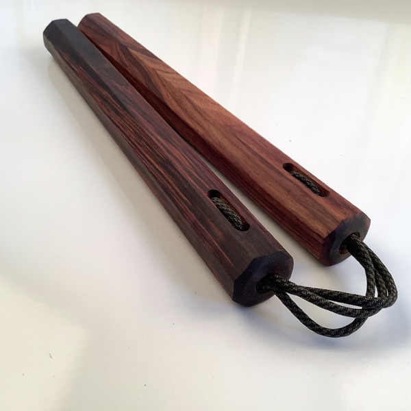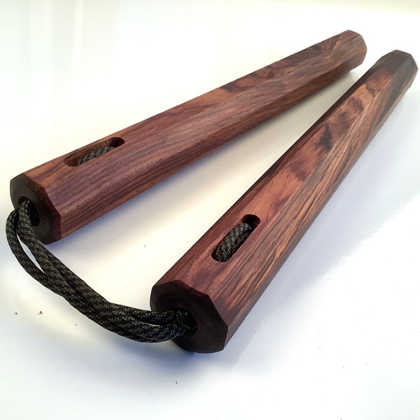Unlike mass produced martial arts weapons made overseas, we designed our Cocobolo Nunchaku to be easy to hold, not get sticky and give you confidence as you practice your forms. Originally the nunchaku was designed from farming tools in China. Occupied Chinese were not allowed to have weapons and a whole range of new weapons sprung from the tools at hand. Our nunchaku are not mass produced, each one is made one at a time. We use exotic hardwoods and try to get every inch of wood used in our product. Some of these woods are hard to find in usable sizes so we take great care to get the most out of each piece. The design is to last and be durable.
