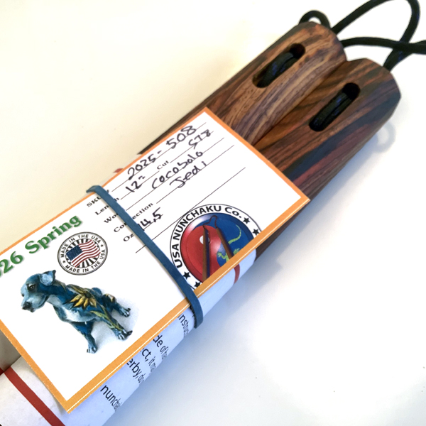 Handcrafted in America, real Cocobolo Nunchaku 2025-508. The cocobolo nunchaku hardwood sets are all one of one which means the nunchaku photographed is the nunchaku you are buying due to the unique grain patterns that vary with each cocobolo set. These nunchaku are always limited in quantity and depending on the market, sometimes unavailable. Like all of our nunchaku each of one of kind made one at a time. All our cocobolo nunchaku are 100% made, sold and shipped in the United States.